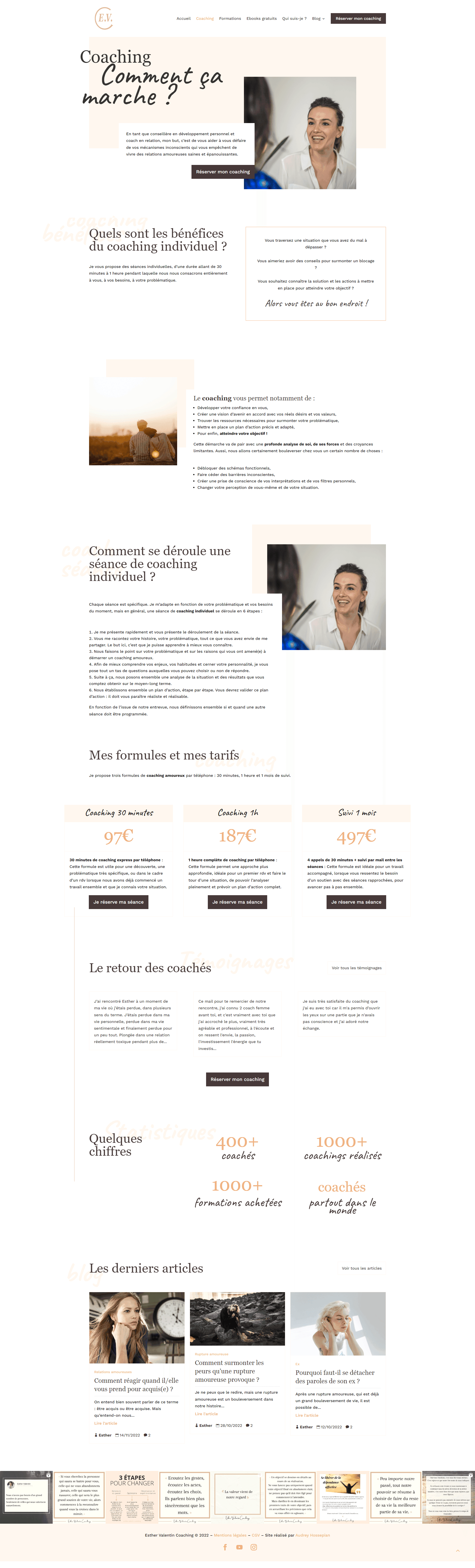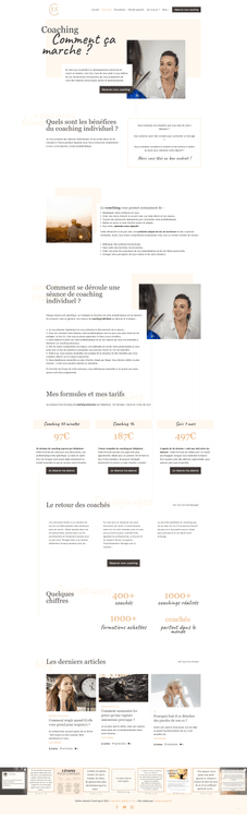 Esther souhaitait une page de présentation claire et impactante pour expliquer sa vision du coaching, détailler ses offres d’accompagnement et rassurer les futures clientes grâce à un discours structuré et professionnel. L’enjeu était d’humaniser la relation tout en clarifiant immédiatement ce qu’elle propose.