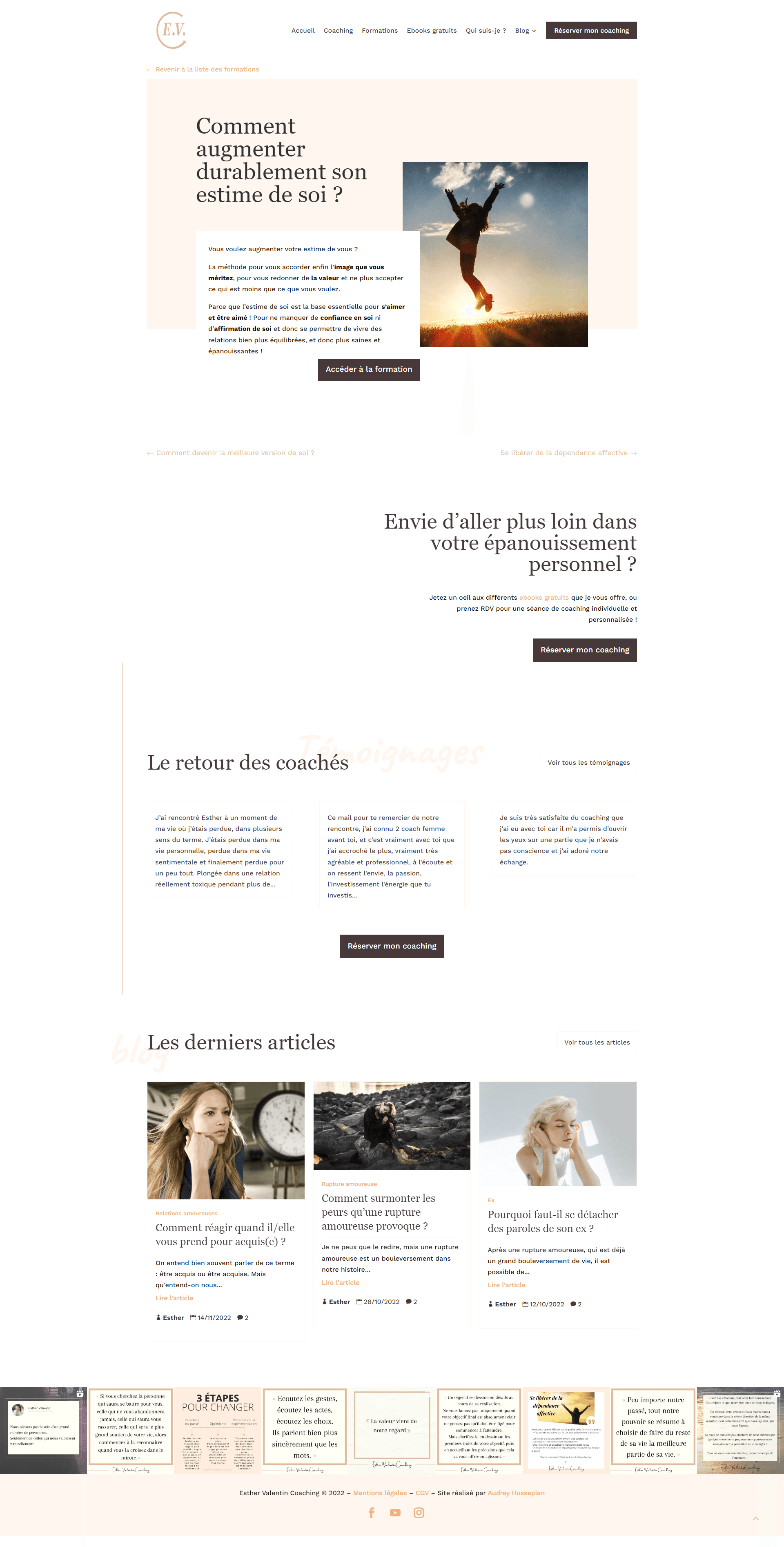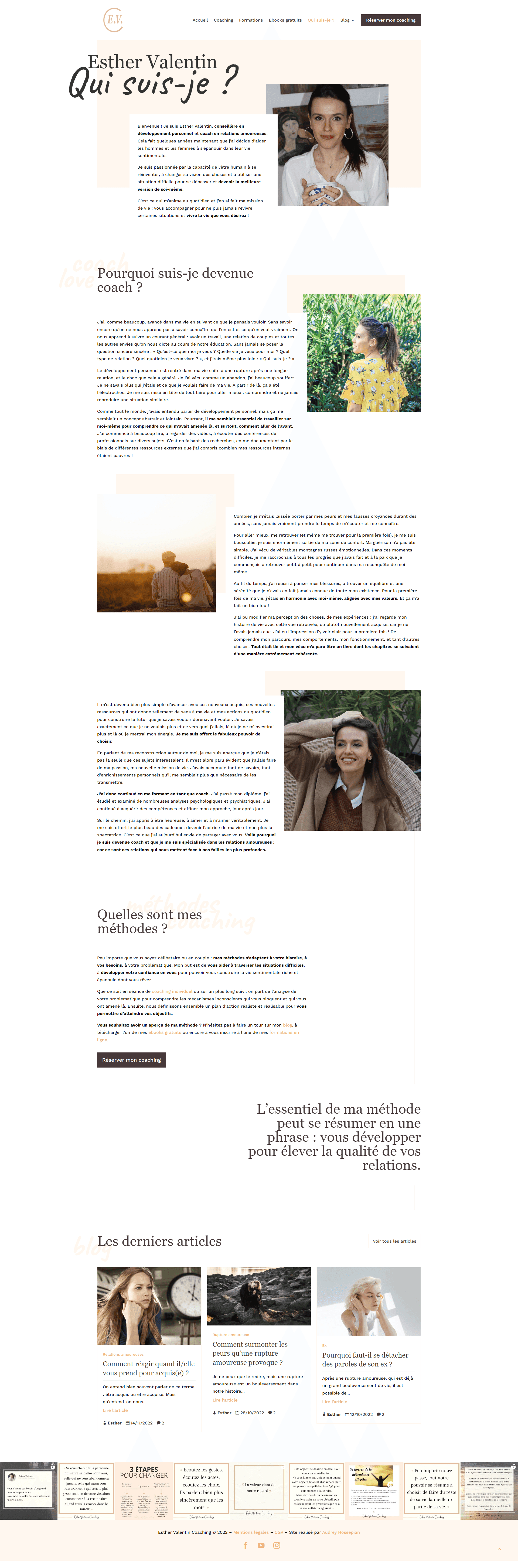 J’ai conçu l’architecture du site en définissant un parcours utilisateur logique, clair et efficace. Chaque section a été pensée pour soutenir la conversion : storytelling autour d’Esther, présentation pédagogique de ses offres, appels à l’action placés stratégiquement, navigation fluide… Les maquettes sur Figma ont permis de valider la direction artistique avant le développement.