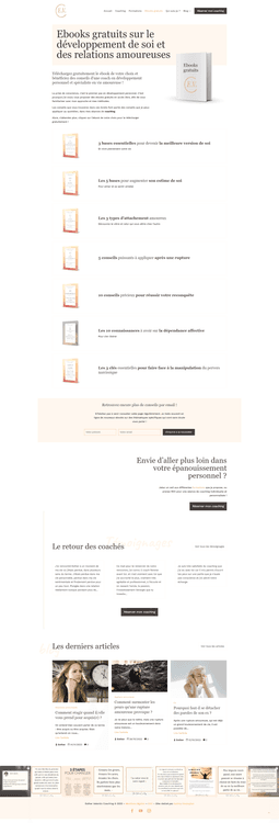 Création d’un site WordPress complet pour une coach : présentation des accompagnements, catalogue d’ebooks et de formations, blog optimisé SEO, intégration de Calendly, types de contenus personnalisés et formation pour une gestion autonome.