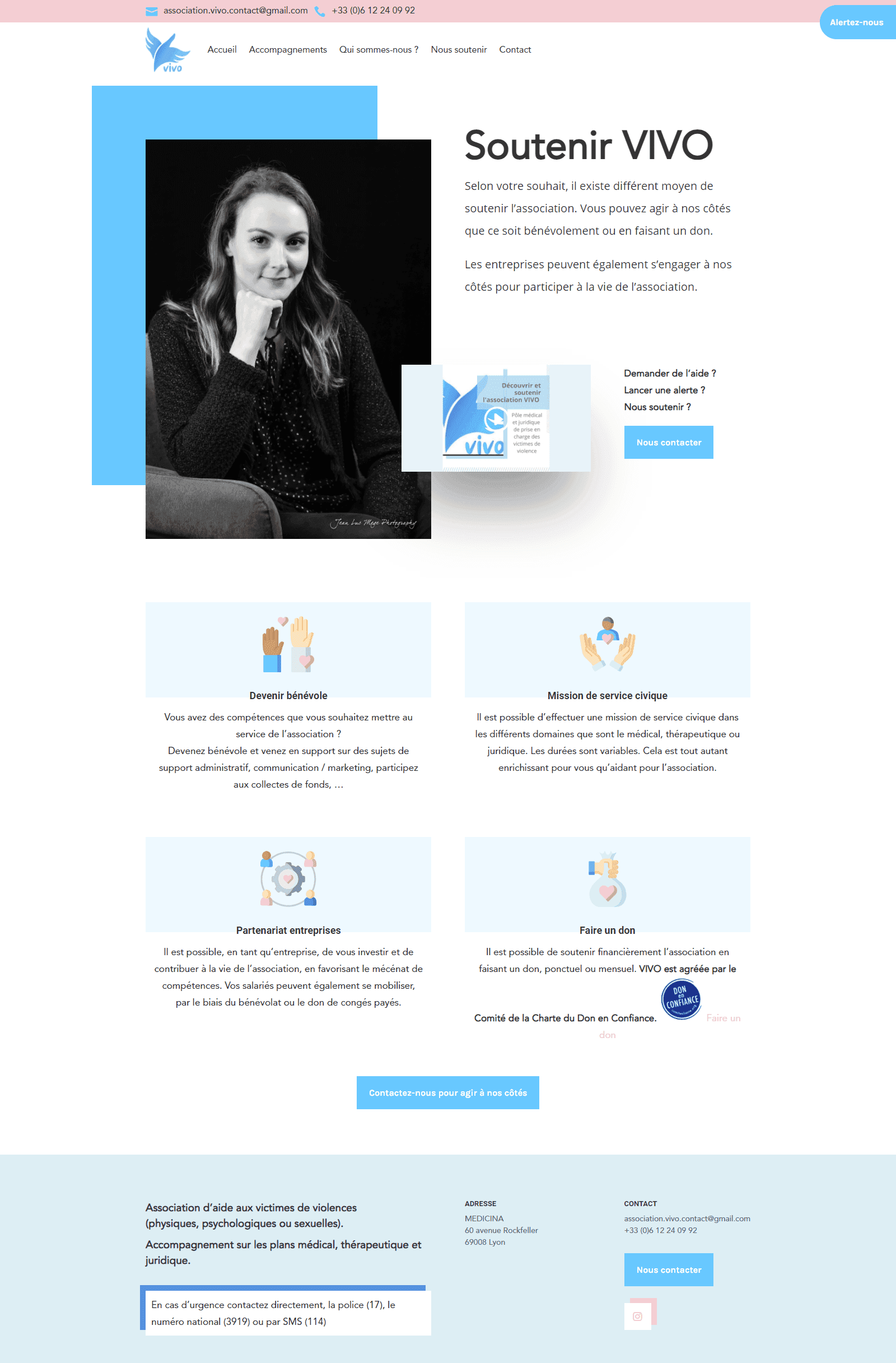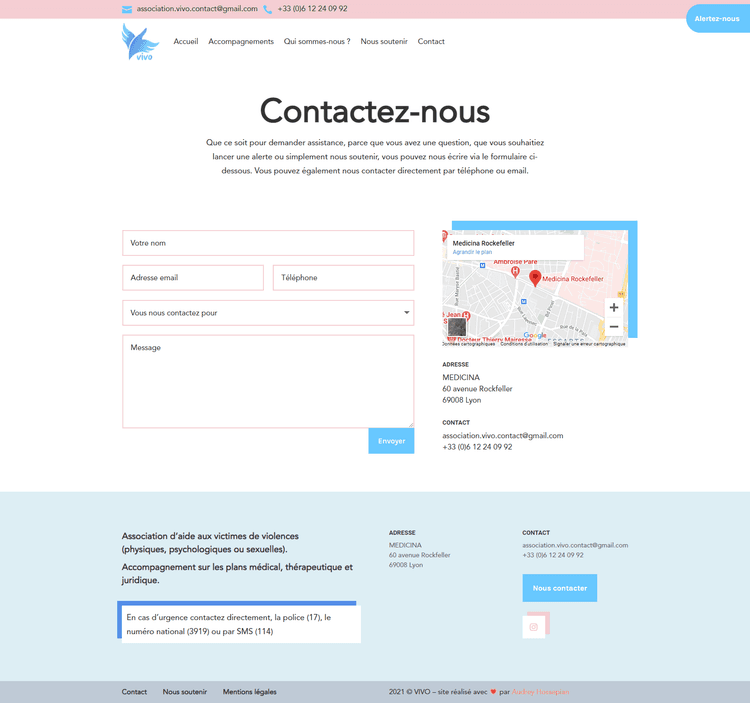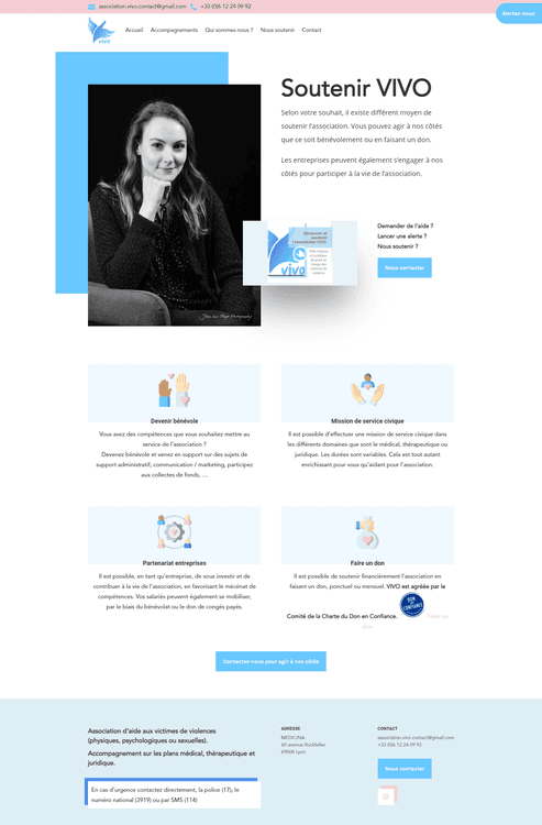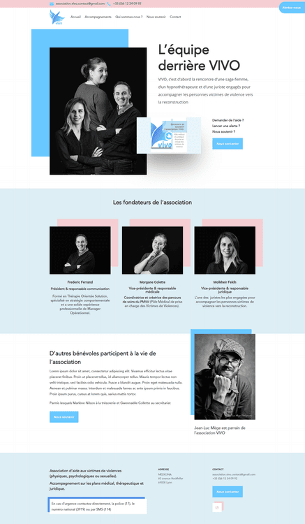 Site vitrine WordPress pour l’association VIVO, conçu à partir d’une charte graphique existante, avec un webdesign doux et contrasté visant à accompagner un public sensible. Interface responsive, administration simple pour l’équipe médicale, juridique et