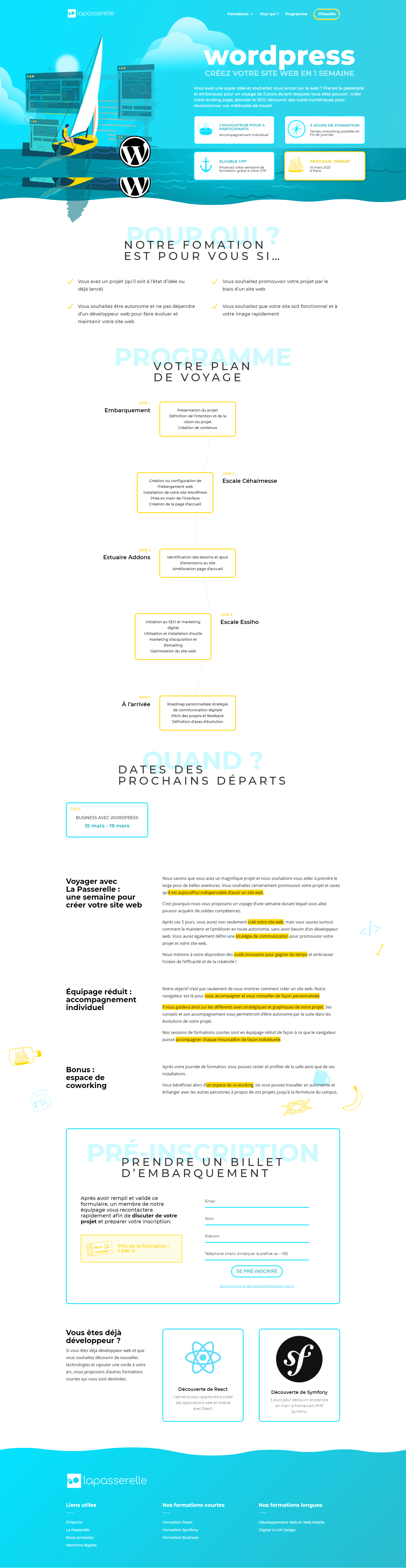 Création du site des formations courtes de La Passerelle sous WordPress. Webdesign inspiré de l’univers maritime, référencement SEO/SEA et intégration d’un module dynamique de gestion des dates.