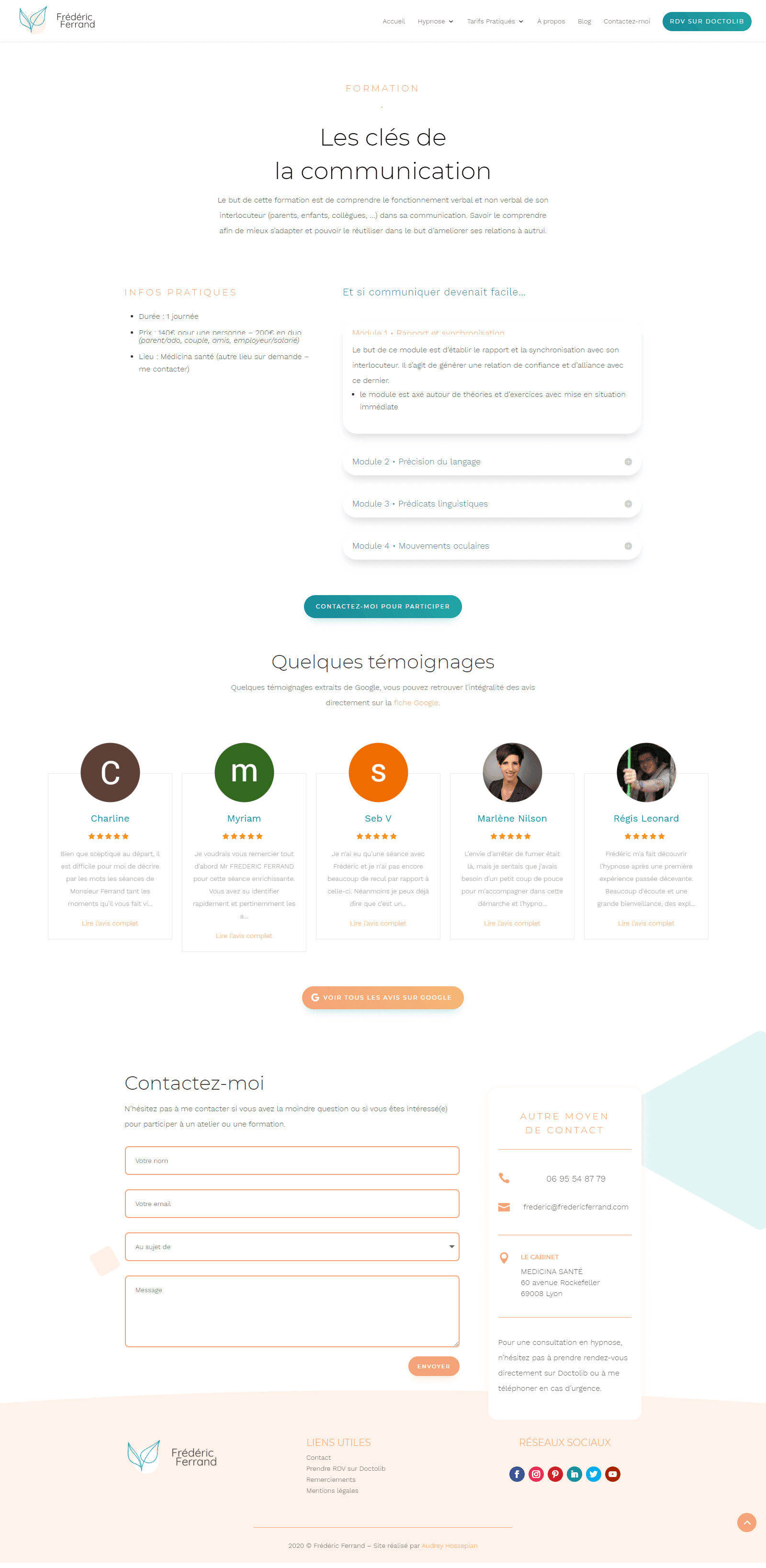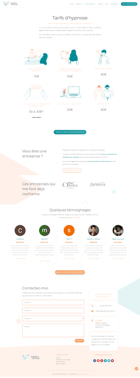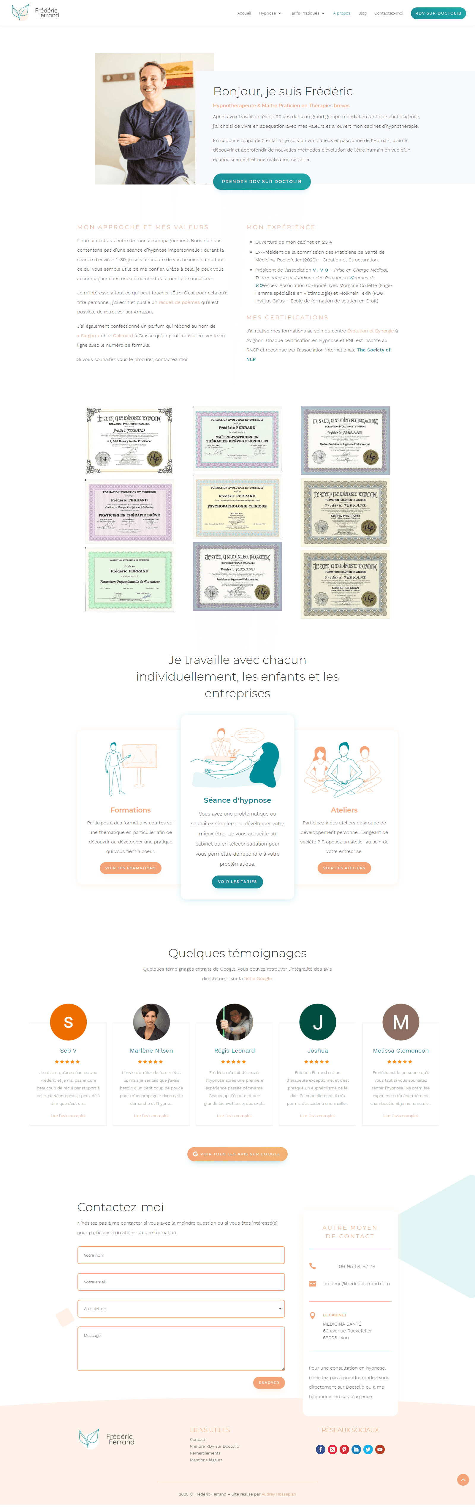 Refonte complète du site WordPress et création de l’identité visuelle pour Frédéric Ferrand, hypnothérapeute à Lyon. Logo, illustrations originales, design apaisant et vidéos de formation à l’outil.